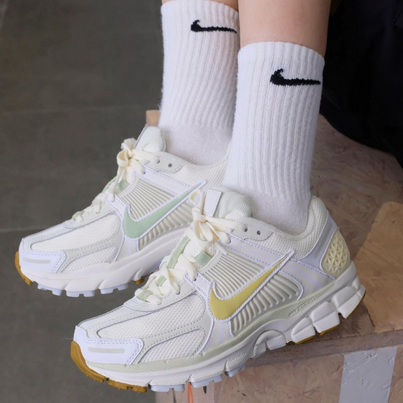 Carve a new path for yourself with the Zoom Vomero 5—your go-to for complexity, depth, and, now, easy styling. The richly layered design incorporates textiles, synthetic suede, and plastic accents to create one of the season's coolest sneakers. This new Zoom Vomero 5 combines "Sail" and "Buff Gold." Its mixed material upper balances the two hues throughout its construction, while a "Sea Glass" green complements the spring-friendly color palette.