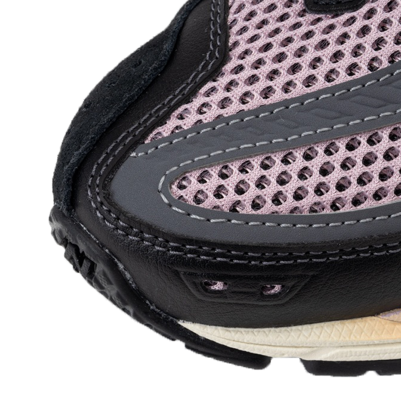 The upper features black synthetic overlays and a dusty rose mesh base. It has a soft tone and a structured shape. Mint green accents on the lace loops, outsole, and heel tab contrast with the darkness. It's just enough to catch the eye without going too far.